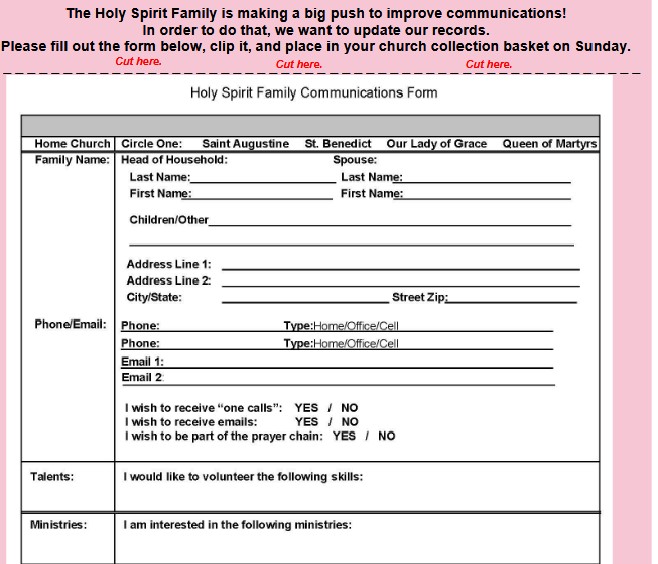 Welcome to our Parish and To Join Our Parish Please Download one of the Formats Below and fill it out and bring it to Mass on Sunday and put it in the Collection Plate. You are welcome to Join our Parish.