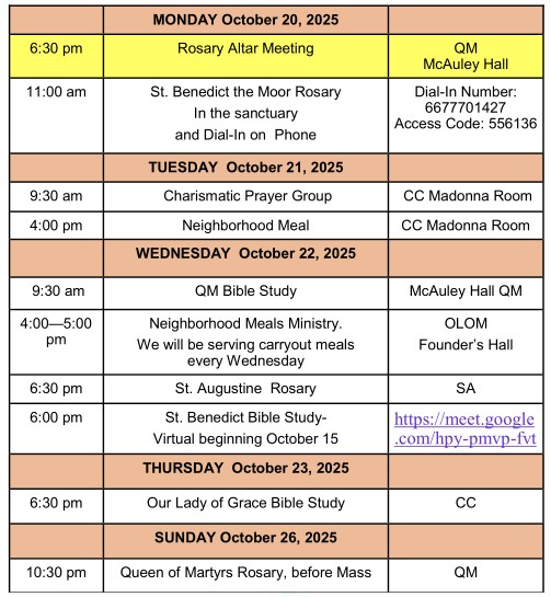 In the Secret of the Rosary, Saint Louis de Montfort said: “Public prayer is far more powerful than private prayer to appease the anger of God and call down his mercy, and Holy Mother Church, guided by the Holy Ghost, has always advocated public prayer in times of public tragedy and suffering.” See you Saturday, October 5, noon. Meet at our Mary statue at Queen of Martyrs.