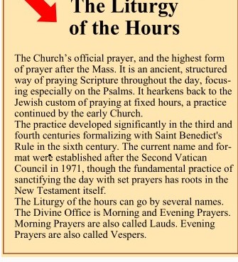 The Church’s official prayer, and the highest form of prayer after the Mass. It is an ancient, structured way of praying Scripture throughout the day, focusing especially on the Psalms. It hearkens back to the Jewish custom of praying at fixed hours, a practice continued by the early Church.