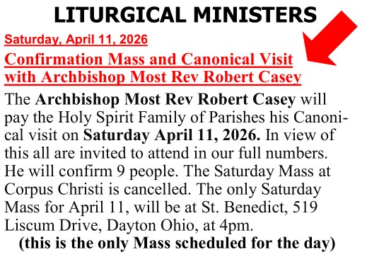 For Anointing, Marriages, Baptisms, or other sacramental preparation, please call the rectory at (937) 855-2289 or (937) 268-6697 to schedule.